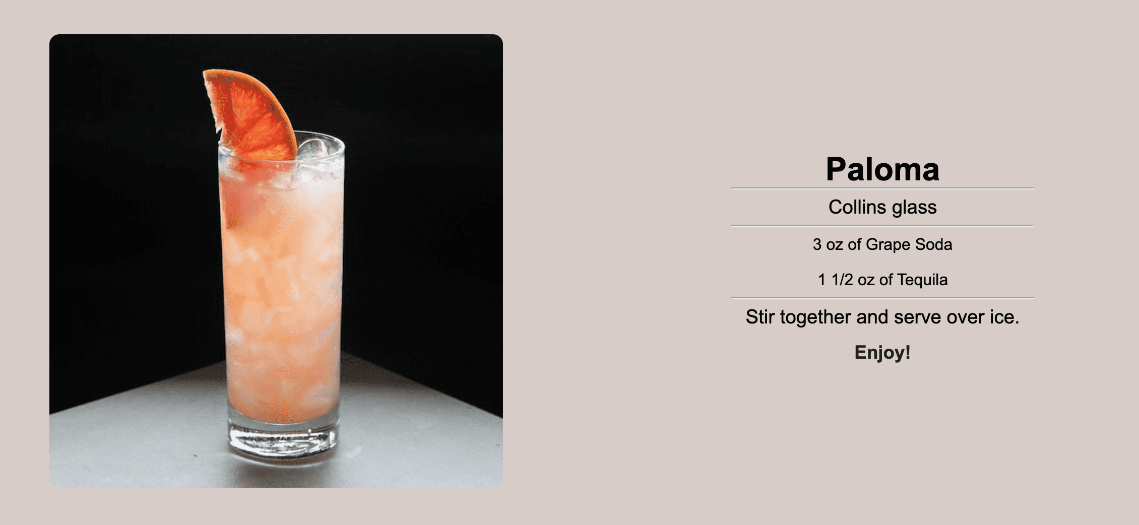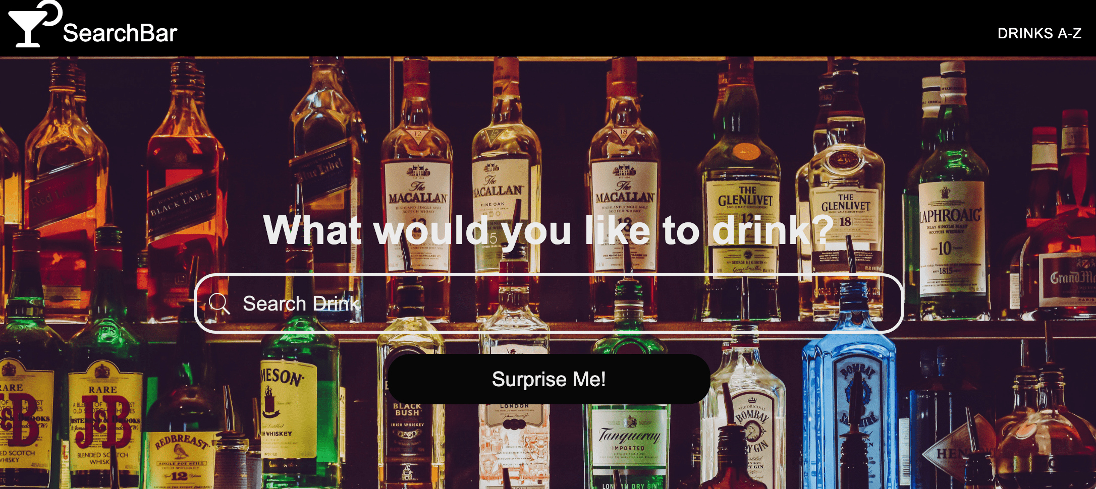 The Search Bar is a React App for users to find detailed instructions on how to make cocktails. Requests are made to The CocktailDB API on the back-end. Result are displayed on the homepage using React.js. A second request is made to display all drinks using CSS Grid. A third request was made to display results of a random drink.